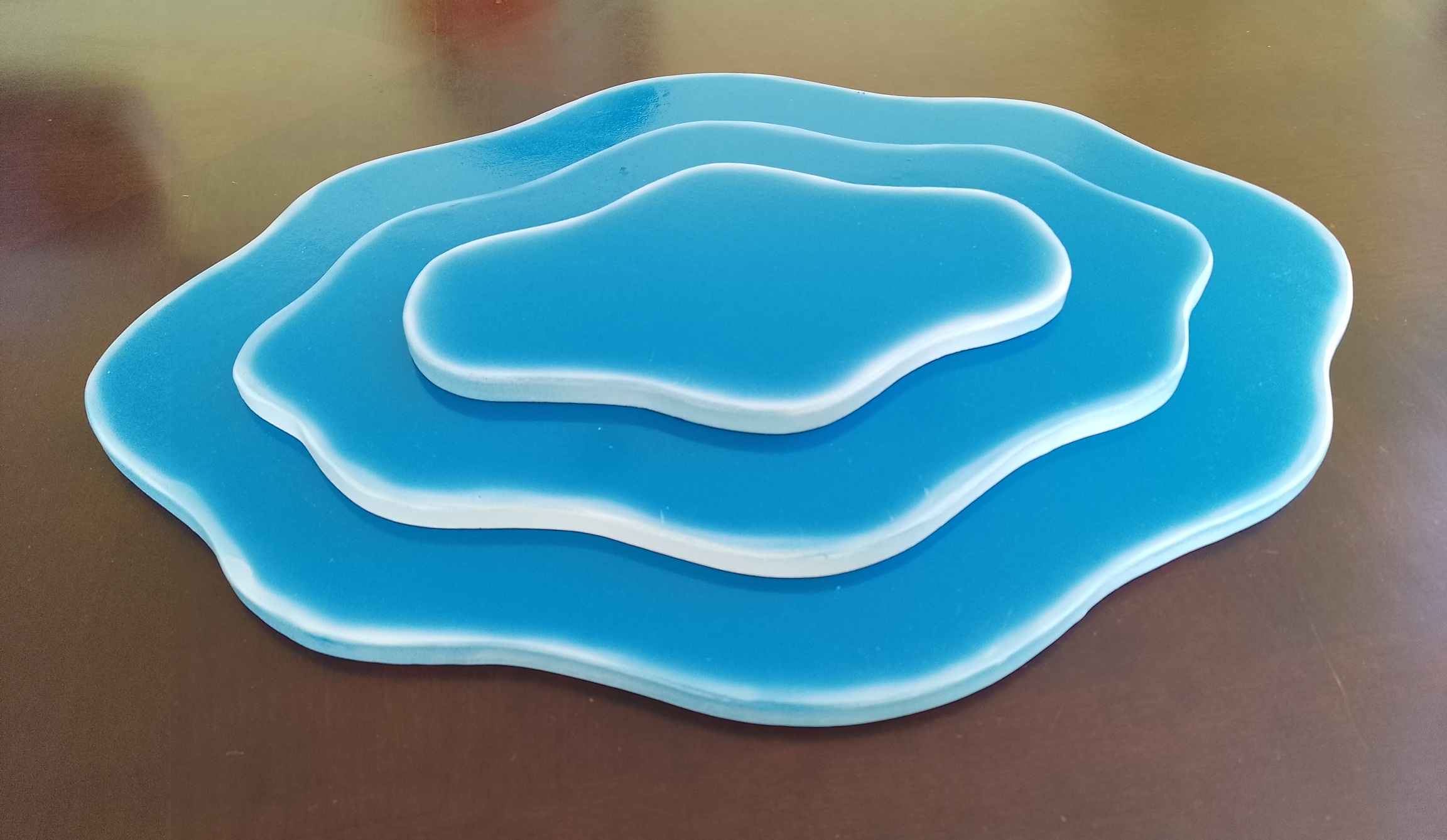 This is a cloud-shaped display base beautifully designed for a collection of Wendt & Kühn–style baker angels or other figurines. The layered wooden base, tinted in soft shades of blue and white, evokes the appearance of fluffy clouds floating in the sky — a delightful stage for these charming little angels in their baker outfits.