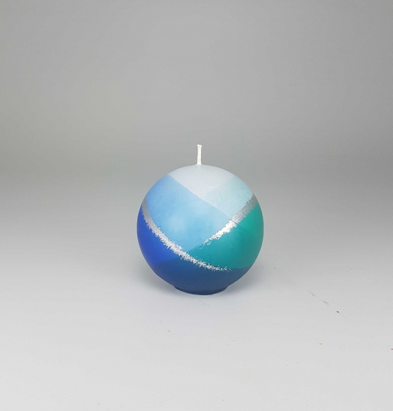 This decorative ball candle brings a fresh, coastal feel to any space. Soft shades of white, light blue, turquoise, and deep blue blend smoothly across its surface, creating a calm, ocean-inspired look.