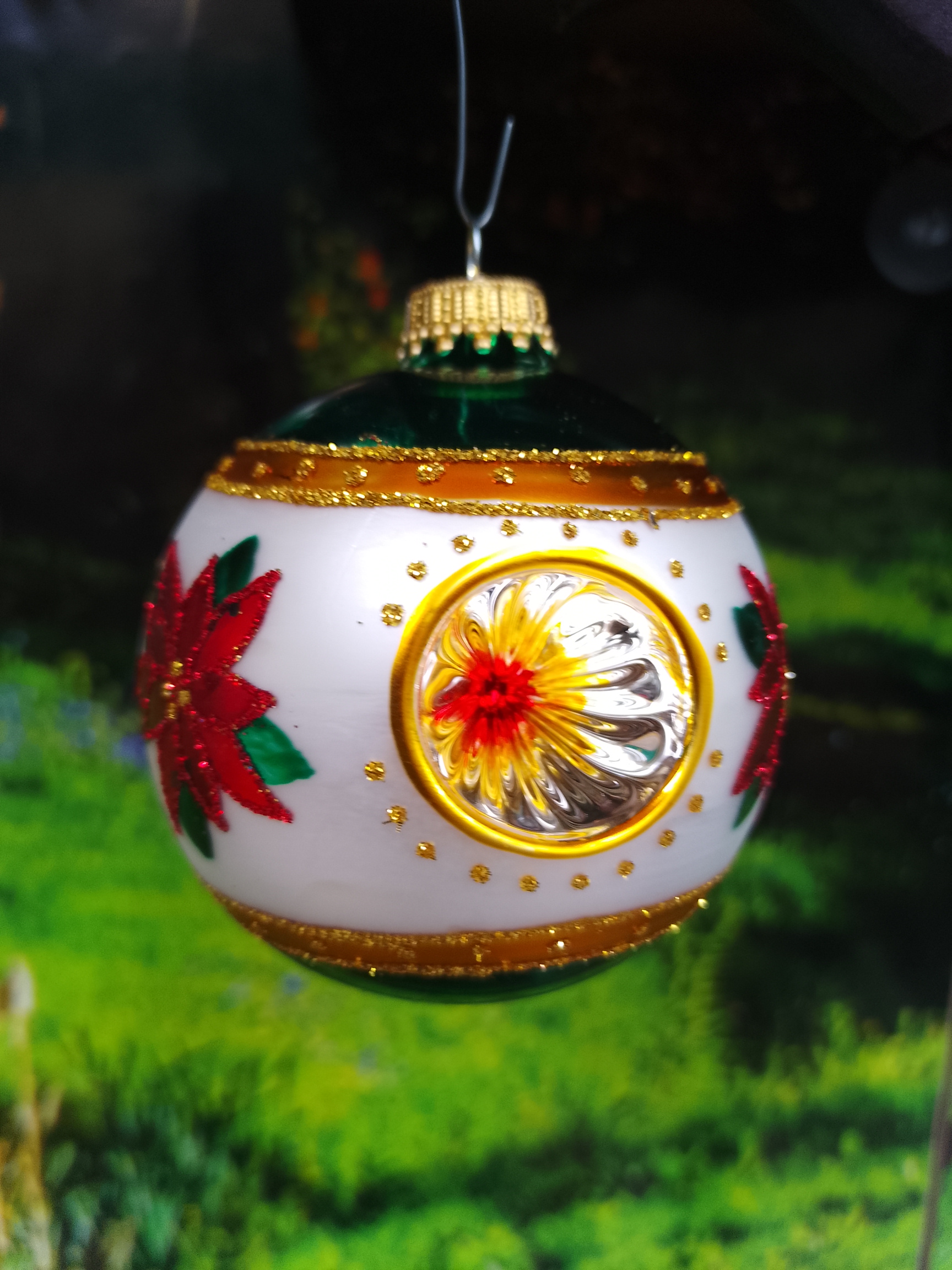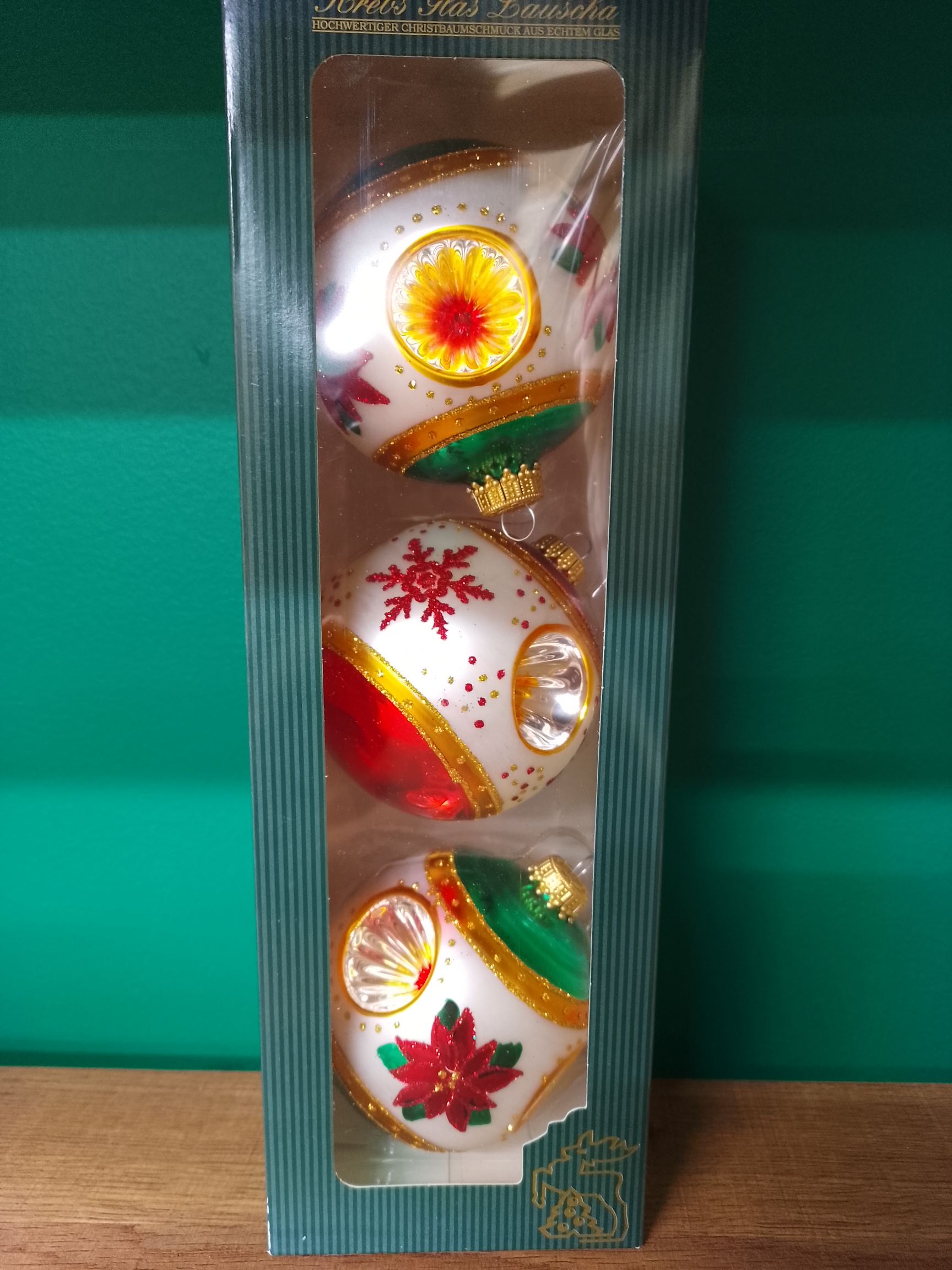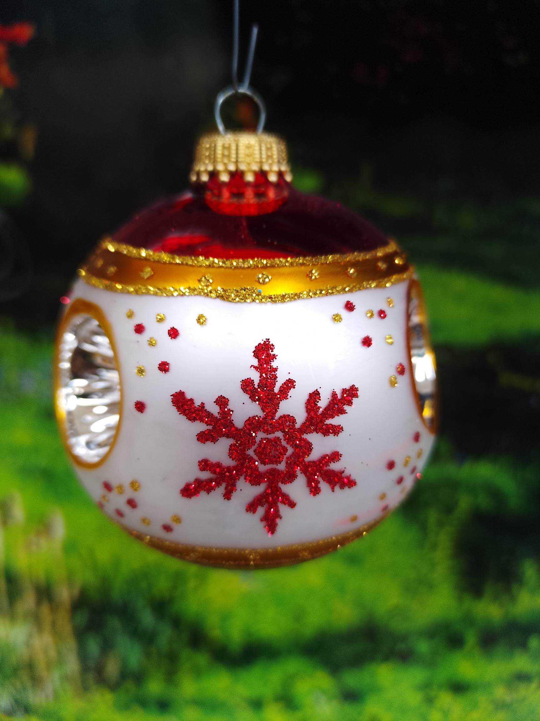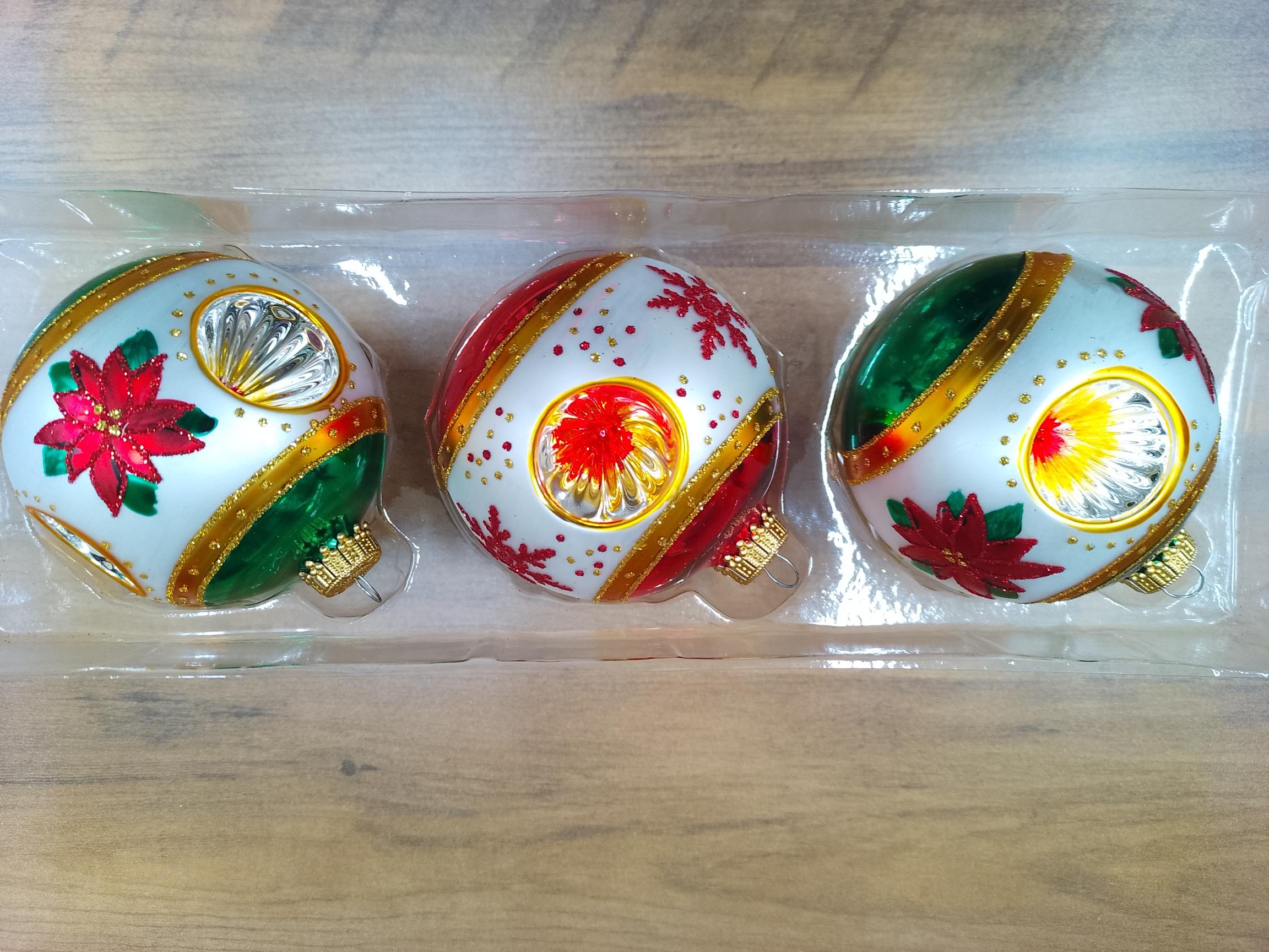 These are traditional mouth-blown glass Christmas ornaments, each measuring about 8 cm in diameter. The surface is finished in glossy red and green tones, richly accented with golden bands. Each bauble features a triple indent (reflex design), creating a reflective sparkle when light hits it. The decorations include poinsettias and delicate snowflakes, both highlighted with hand-painted details and shimmering glitter for an elegant festive look. Set of 3.