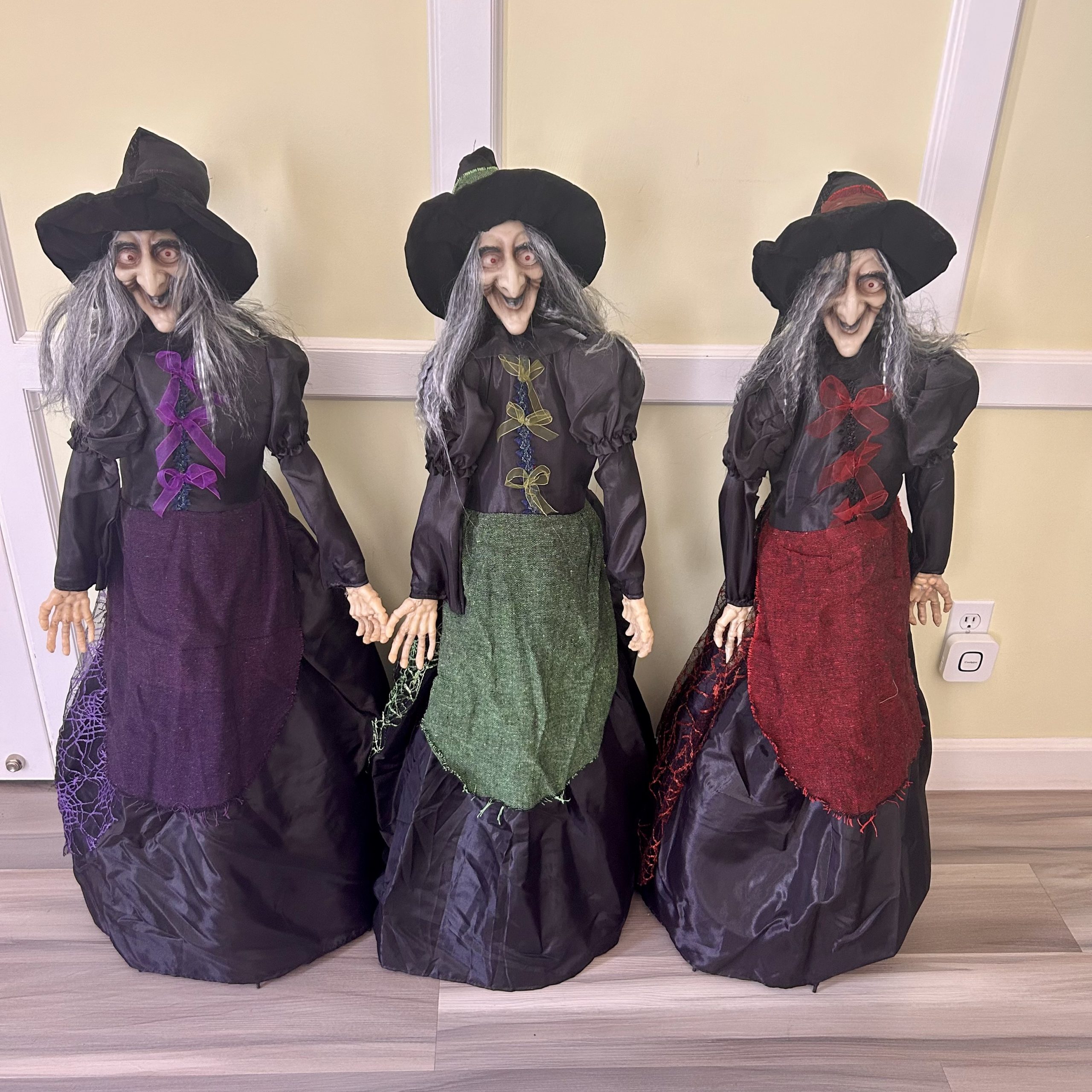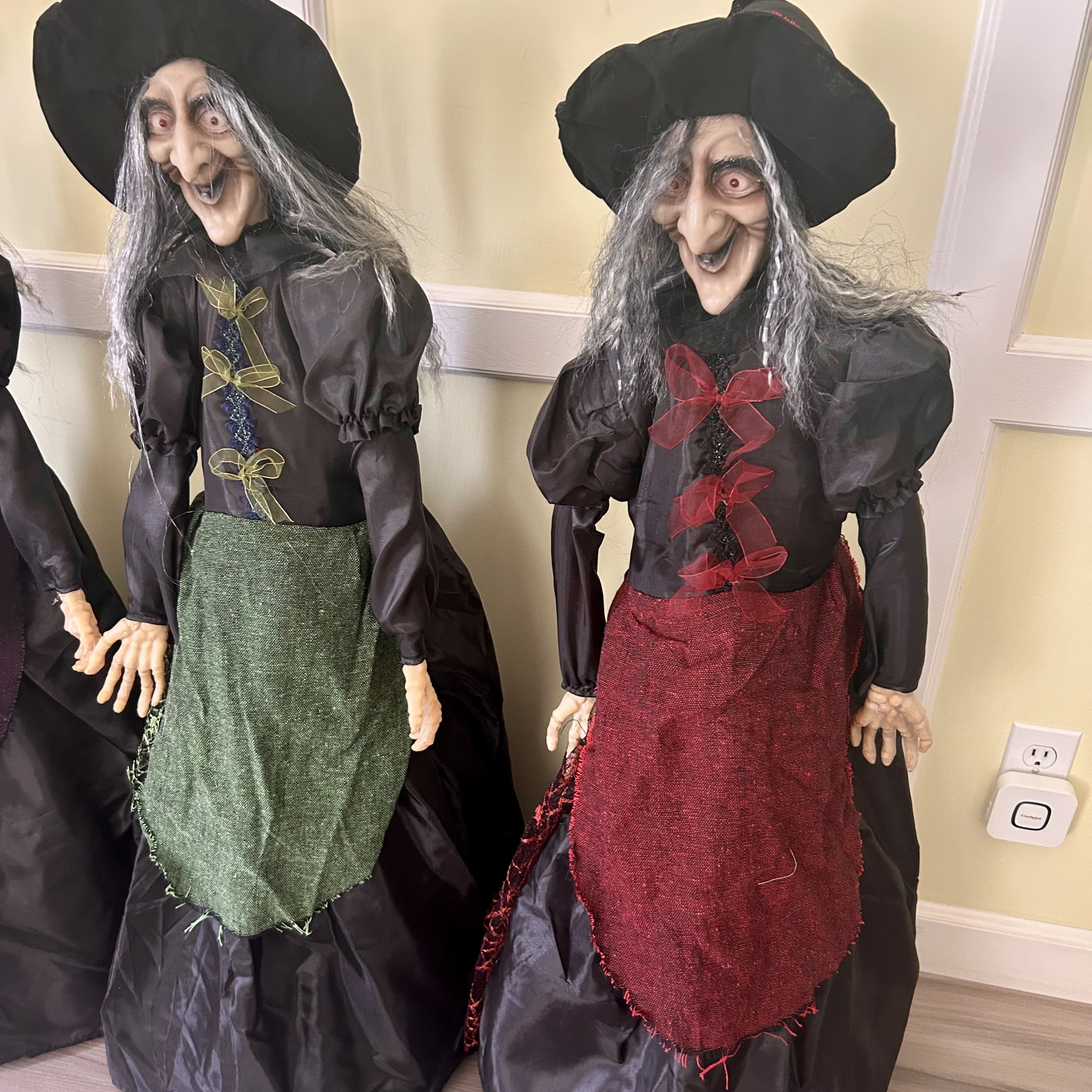 This tall, traditional witch makes a perfect eye-catching Halloween decoration. With her eerie grin, long grey hair, and glowing eyes, she brings a spooky atmosphere to any room. Dressed in a black blouse with puffed sleeves, sheer bows, and a rustic colorful apron, she combines old-world charm with Halloween flair. Her bony hands and mischievous look give her a lifelike, animated presence that will delight and startle your guests alike.
