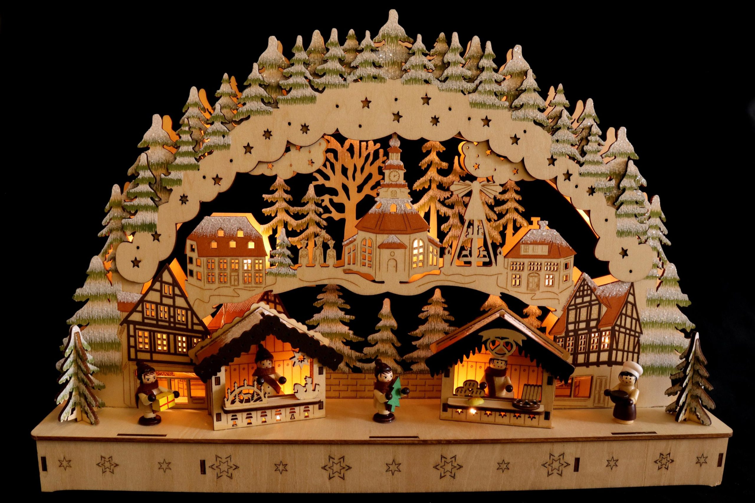 Bring the charm of a traditional German Christmas market into your home with this beautifully handcrafted wooden Schwibbogen. Featuring a snow-covered village, cozy timber-frame houses, and miniature market stalls with bakers and toymakers, this illuminated arch captures the magic of the Erzgebirge. Every detail is lovingly carved and hand-painted, creating a festive centerpiece that radiates warmth and nostalgia — just like Christmas in the old country.