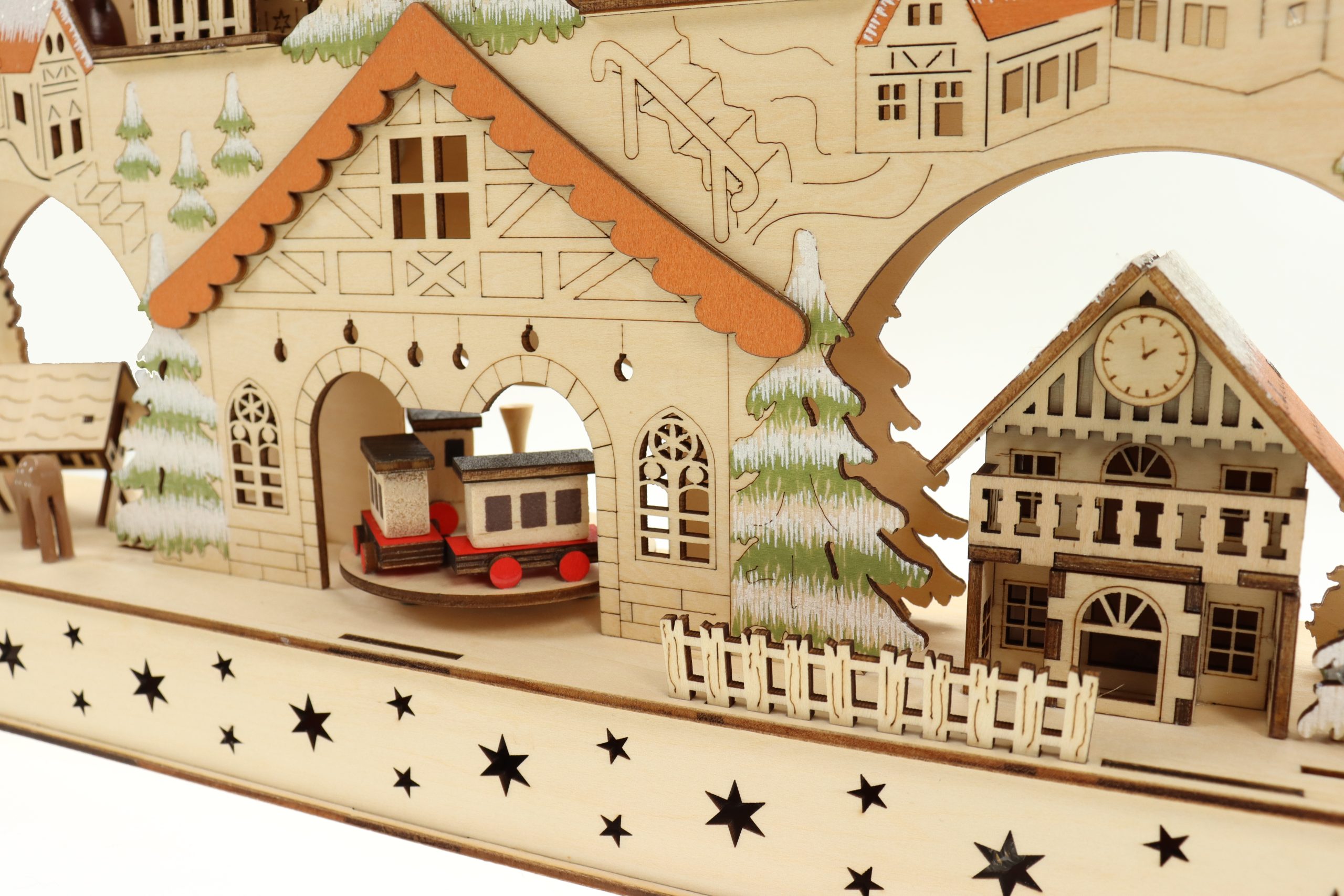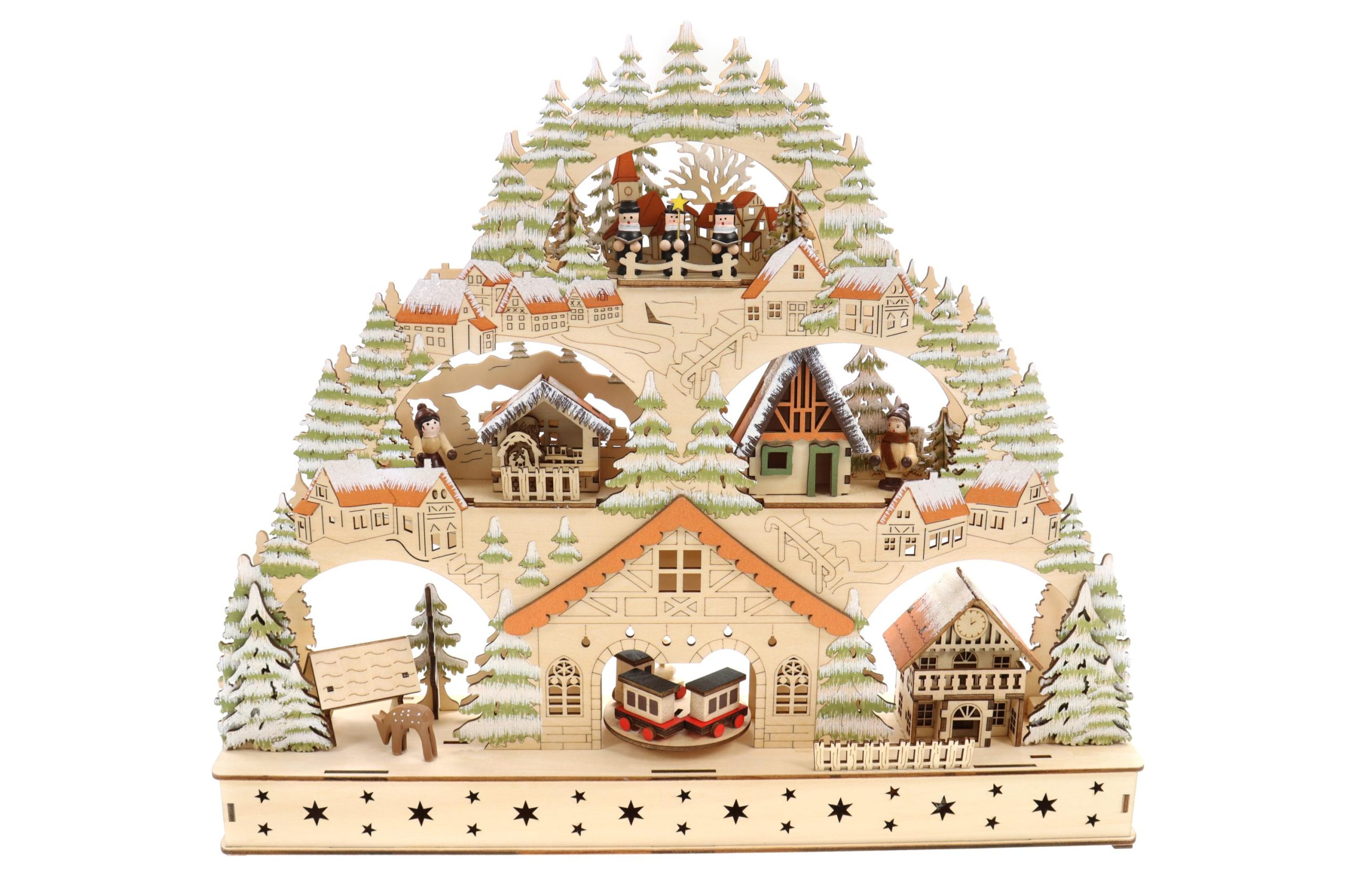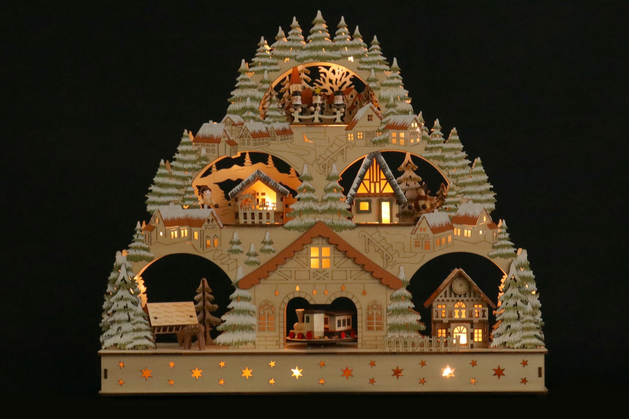 This handcrafted multi-tier wooden Schwibbogen features a glowing alpine village with a moving train, carol singers, and snow-covered houses. Beautifully illuminated with warm LED lights, it brings the timeless charm of the Erzgebirge Christmas tradition to your home.