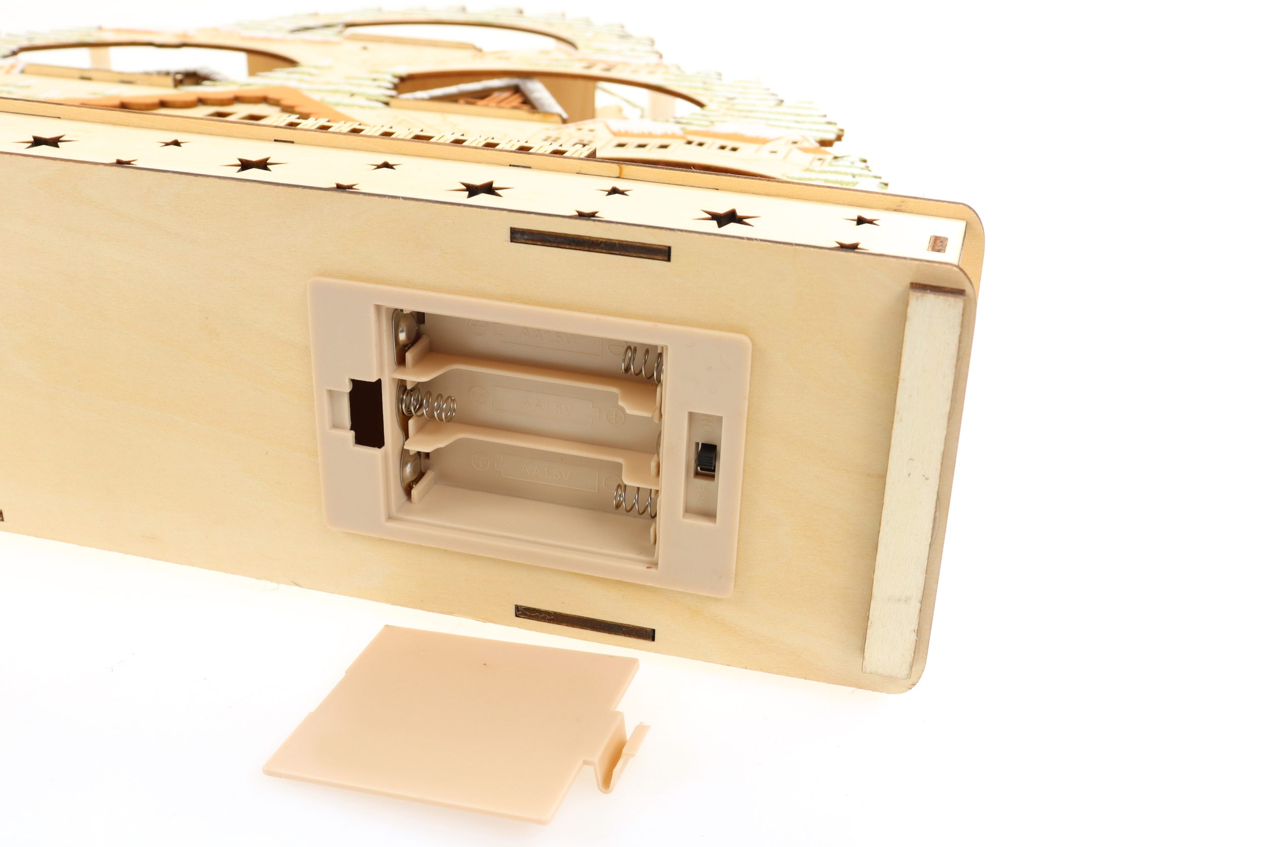Expertly handcrafted from natural wood, the piece combines fine laser engraving and traditional hand-painting. The integrated LED lights bathe the scene in a gentle golden light, highlighting every tiny detail — from rooftops to treetops. It’s an enchanting display that captures the peace, joy, and craftsmanship of a German Christmas.