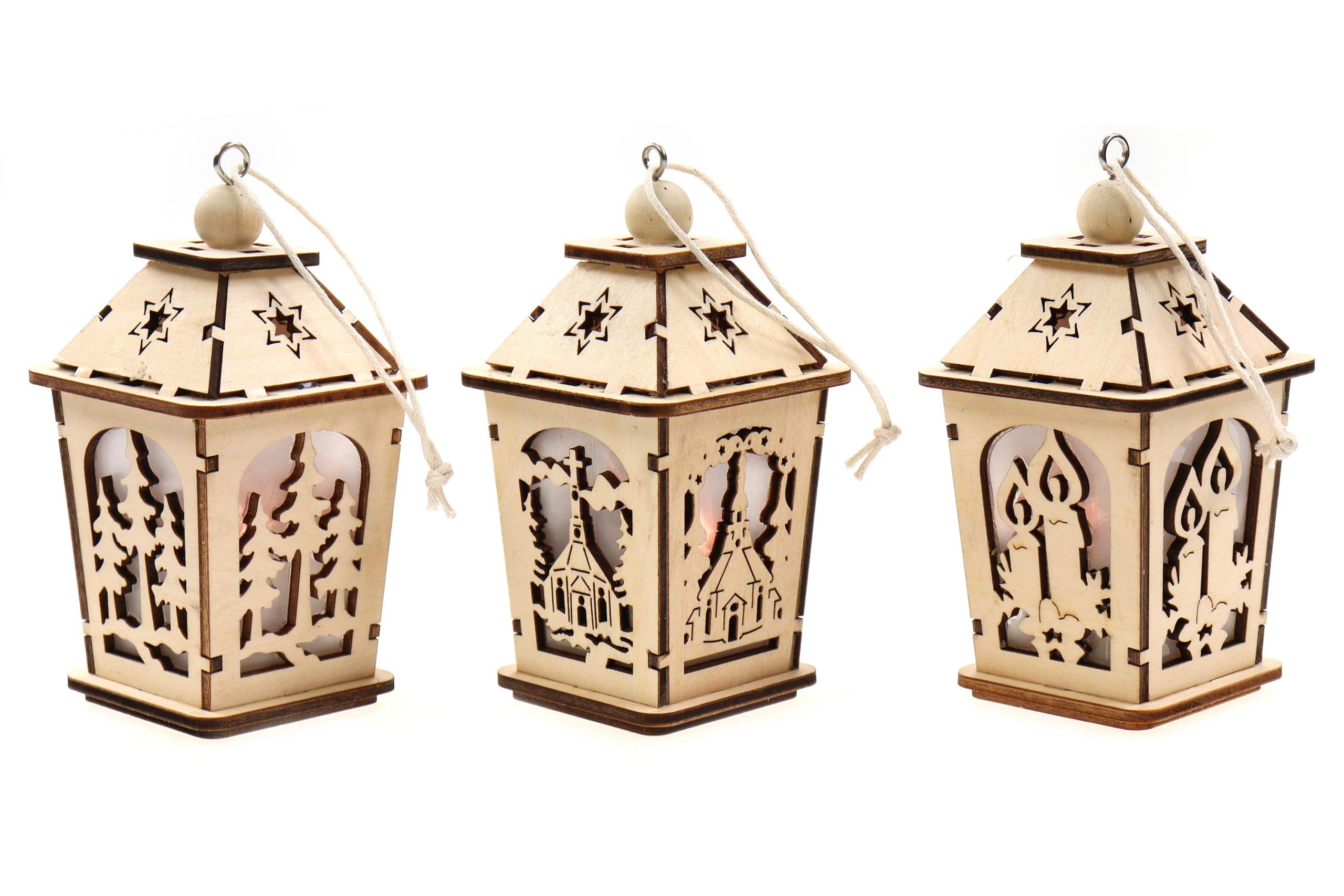 Lighted Lantern Candles: These charming wooden LED lanterns bring the warm glow and peaceful beauty of a traditional German Christmas into your home. Each lantern is carefully crafted from natural wood and features intricately laser-cut designs that come to life when illuminated.