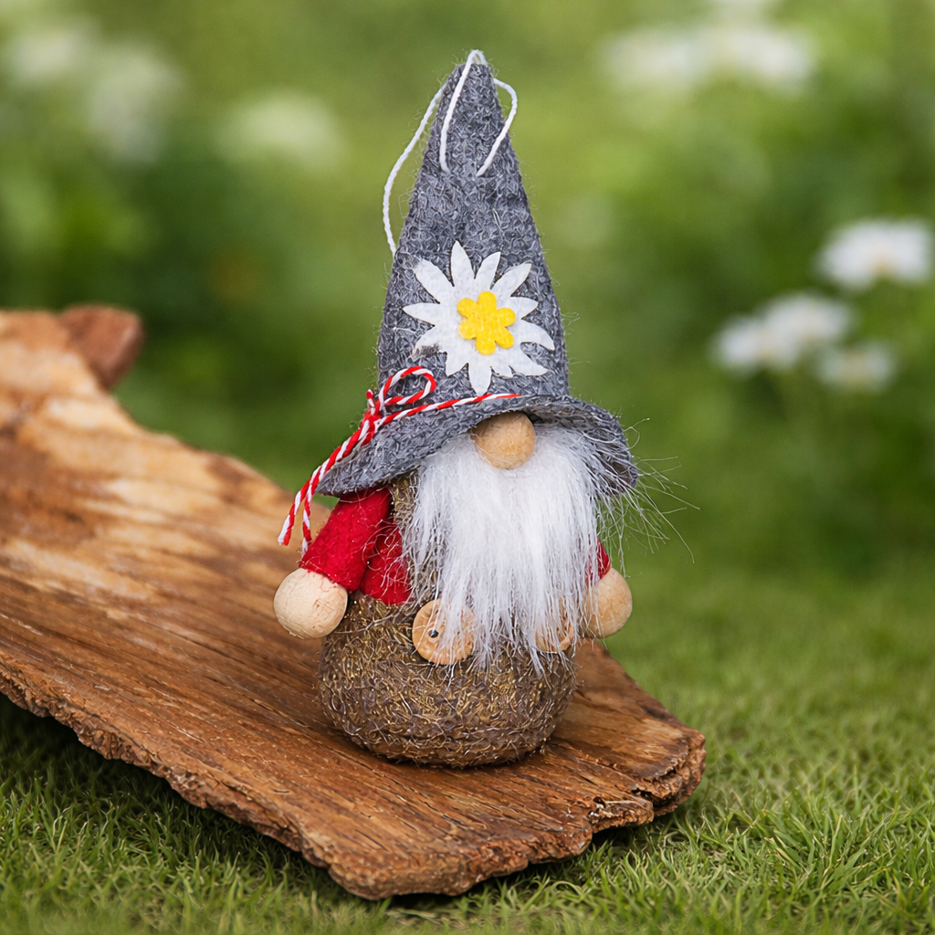 A charming handmade gnome with a grey felt hat adorned with a daisy, a soft white beard, and a red gingham apron. Set on natural wood with a fresh green background, it brings a warm, rustic touch to any décor.