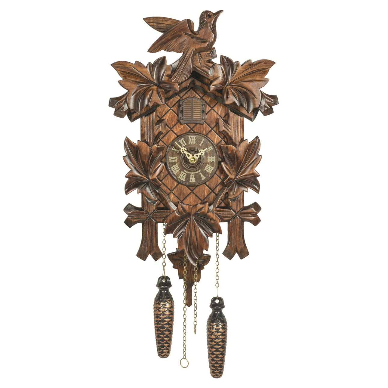 Handcrafted-style wooden cuckoo clock with intricate leaf carvings and classic pinecone weights. A timeless piece that brings traditional charm and warmth to any home décor.
