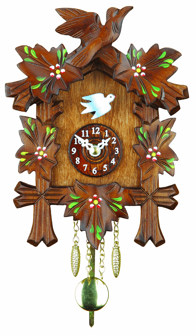 Trenkle Miniature Clock 70PBQ: A cuckoo clock is a type of clock, typically pendulum driven, that strikes the hours with a sound like a common cuckoo call and has an automated cuckoo bird that moves with each note. Some move their wings and open and close their beaks while leaning forwards, whereas others have only the bird's body leaning forward. The mechanism to produce the cuckoo call has been in use since the middle of the 18th century and has remained almost without variation.